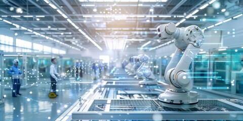 Modern industrial factory with digital interface and robotic arms