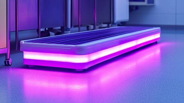 Automated robotic hospital cleaner UV light bar, glowing violet, subtle sterilization, clean floor.
