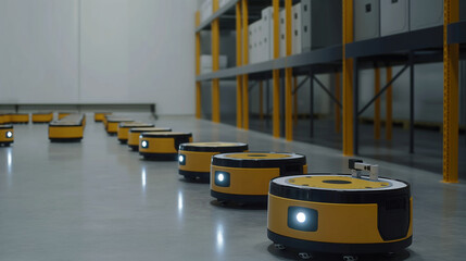 A logistics team assembling delivery robots in a high-tech warehouse facility. Quality, high level, reliability, team
