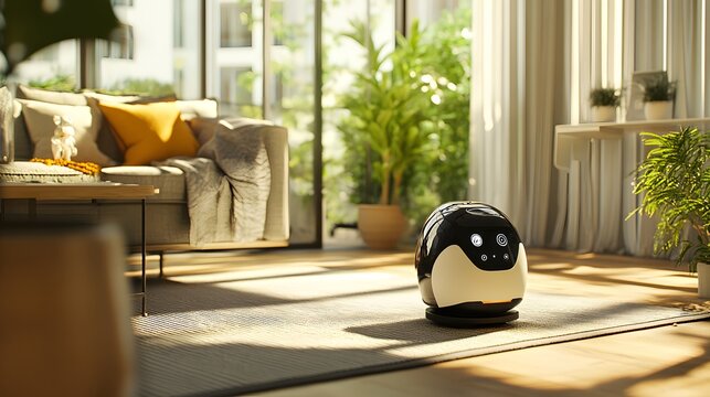 Young man petting chrome robotic dog on gray sofa in cozy modern smart home interior