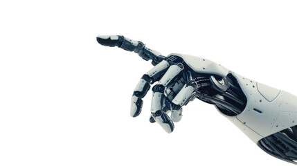 white cyborg robotic hand pointing his finger trying to reach something isolated on white background