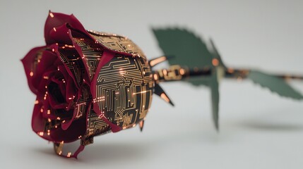 Robotic hands gently offering a white rose with green leaves on a dark background