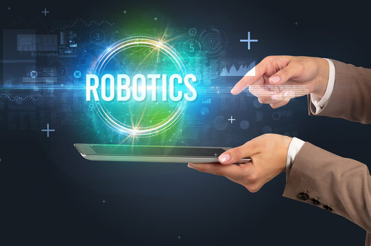 Close-up of a touchscreen with ROBOTICS inscription, new technology concept