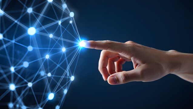 A hand in a suit touching a digital screen with blue gears and orange interface elements displayed