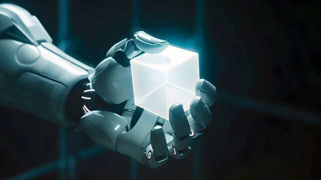 Big data, machine learning, blockchain and AI algorithm the new technology change the world concept, hand of robotic holding digital cube
