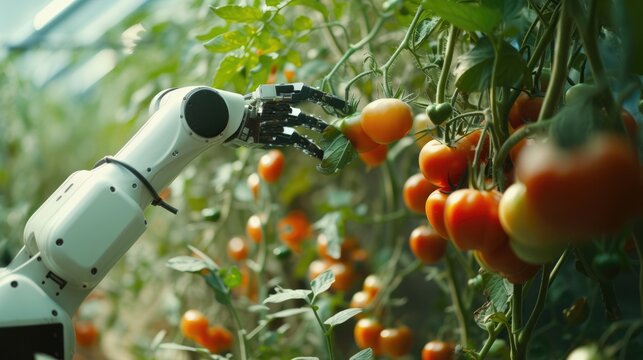 A robotic arm efficiently picks harvesting product, a type of vegetable, in a greenhouse to produce healthy and natural foods. AIG41