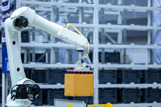 Robotic arm handling boxes on pallets in automated warehouse, Logistics warehouse automation robotics, Robotic arm automated factory packing system efficient industrial box handling and logistics