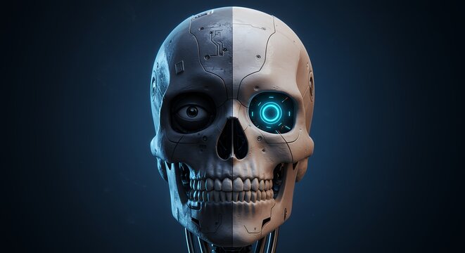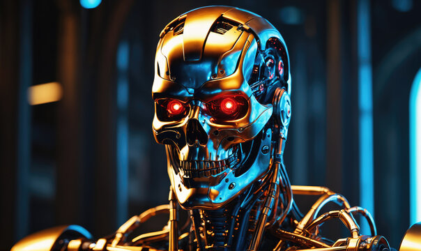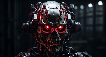 This image showcases a striking metallic robotic skull, featuring glowing red eyes, symbolizing the intersection of technology and humanity's future in a captivating artistic style.