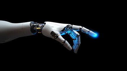 A close-up of a robotic skull with red eyes, set against a blue and black background