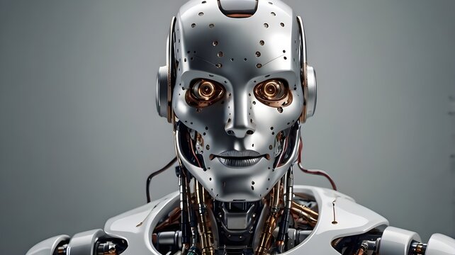 Closeup of a detailed steampunk robot skull with intricate metallic gearwork and advanced robotic technology