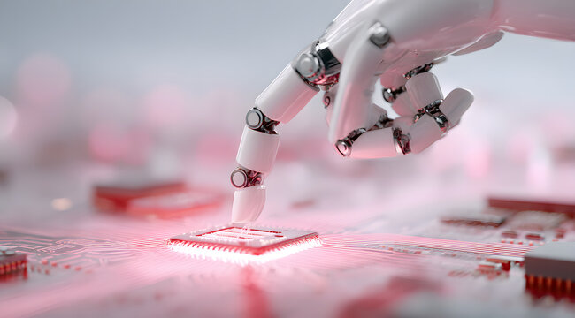 Robotic arm soldering precision microchip on circuit board with warm workshop lighting