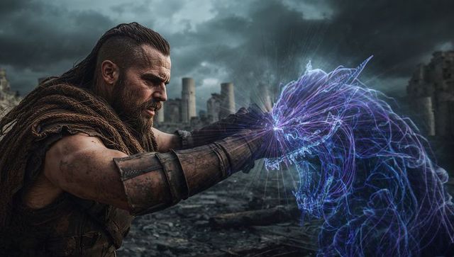 Channeling bearded warrior projecting glowing wolf energy over ruined battlefield
