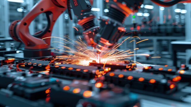 Close-up of a high-speed assembly line where electric vehicle battery cells are being laser welded into packs, with sparks visible and robotic arms in motion.