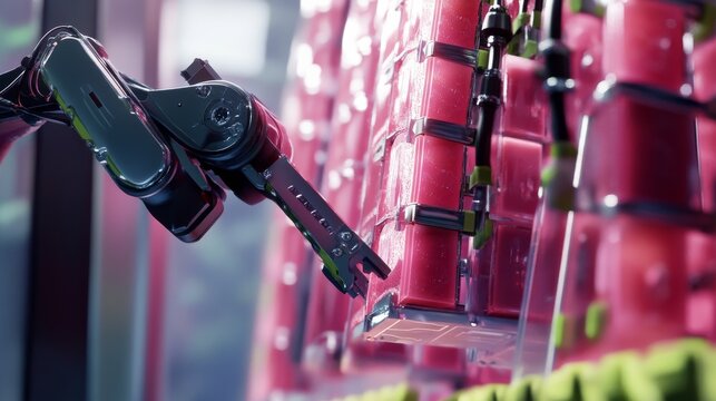 A robotic arm in an electric battery manufacturing plant, assembling lithium-ion battery cells with AI precision for energy storage, Battery-tech style