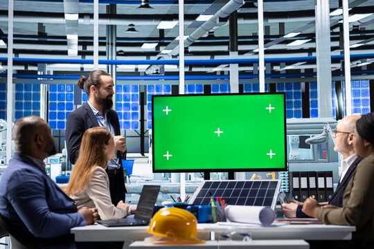 Shareholders being shown strategic growth opportunities on mockup display. Investor addresses factory management during investment pitch meeting using green screen monitor as visual aid