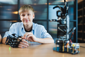 Engineering student assembling a robotic arm using a computer in a technology workshop. Service engineer holding a robot controller and inspecting the robotic arm's welding hardware.