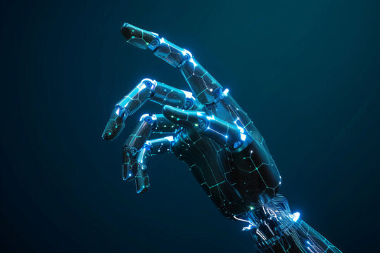 A robotic hand with blue lights is shown in a dark blue background. The hand is pointing to something, but it is not clear what it is. Scene is somewhat mysterious and intriguing