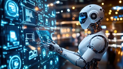Close-up of an AI robot hand interacting with a glowing holographic control panel in a minimalist futuristic setting.
