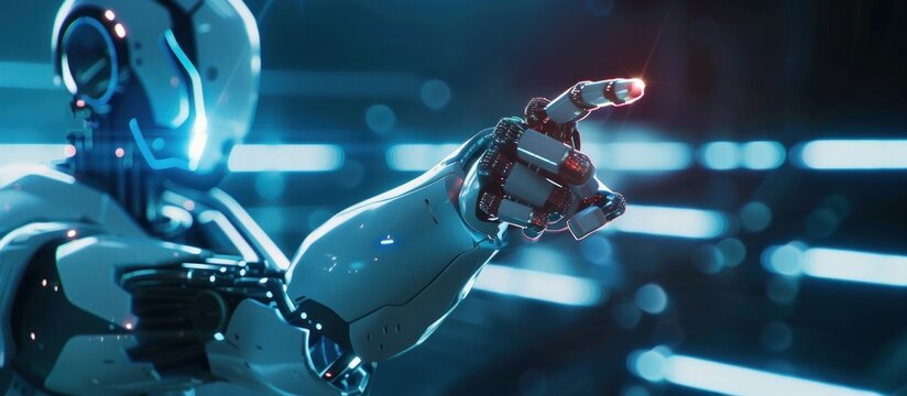 Futuristic close-up shot of an AI robot’s hand using a glowing holographic control in a clean minimalist environment.