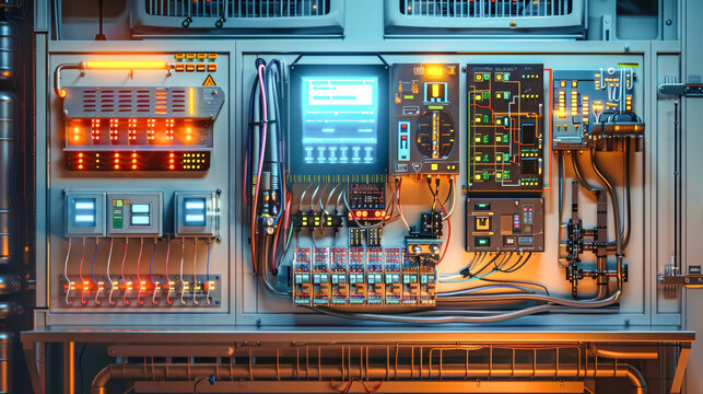 Industrial control panel featuring smiley display, emergency stop button, joystick knobs