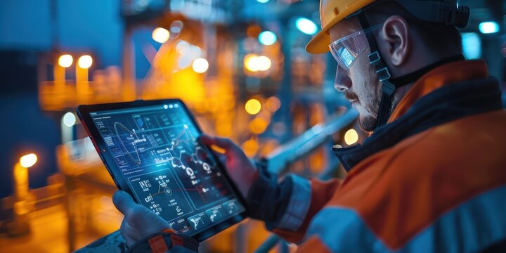 Close-up of a rugged tablet used for condition monitoring on site, detailed view of data display, early morning