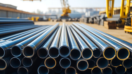 Steel pipes stacked neatly in an industrial yard, ready for construction. Cylindrical objects gleam in sunlight, showcasing robust material and organized storage in a metal facility.