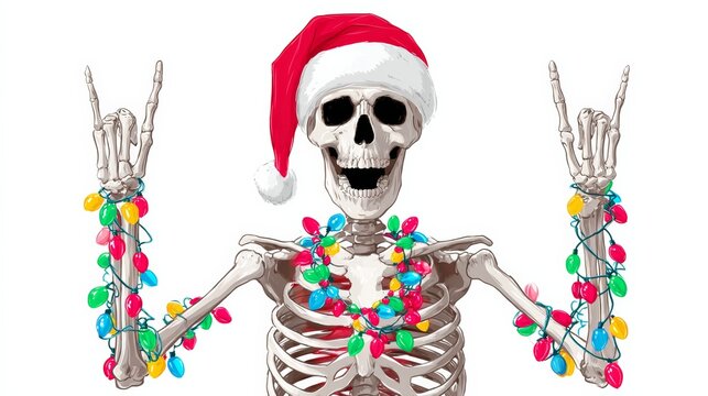 Skeleton wearing a festive red Santa hat, joyfully displaying rock and roll hand gestures while adorned with colorful Christmas lights, embodying a fun and quirky holiday spirit in a playful illustrat