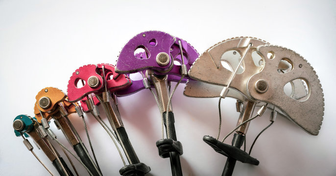 Young woman climber selects tools while processing the route while on a safety station on a vertical rock wall in the mountains, close-up, panorama.