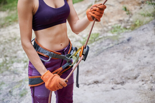 Close up of young female climber belaying leader during rock climbing outdoors, using rope, grigri, carabines and gloves. Concept of teamwork, trust, extreme sport and outdoor activity.
