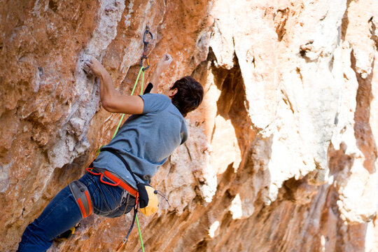 Strong male fingers cling to a rock ledge - close-up rock climbing