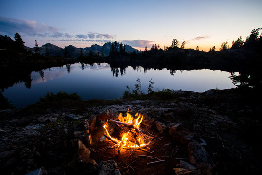 A bonfire beside a lake in the mountains