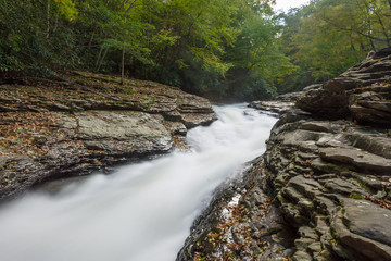 Mountain waterfall in a forest in Valle d'Aosta, flows between trees and rocks.