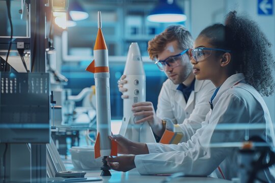 Two Scientists Working on a Rocket Model in a Lab