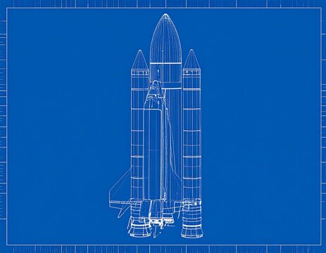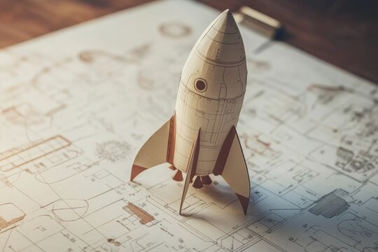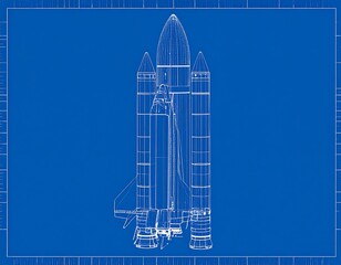 A detailed blueprint of an advanced rocket and aircraft design sprawls across the surface, emphasizing engineering precision and innovative concepts in aerospace technology