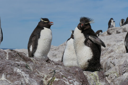 A bonded pair of Rockhopper Penguins engaged in courtship - Falkland Islands
