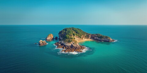 Isolated tropical island with rocky shores and lush vegetation