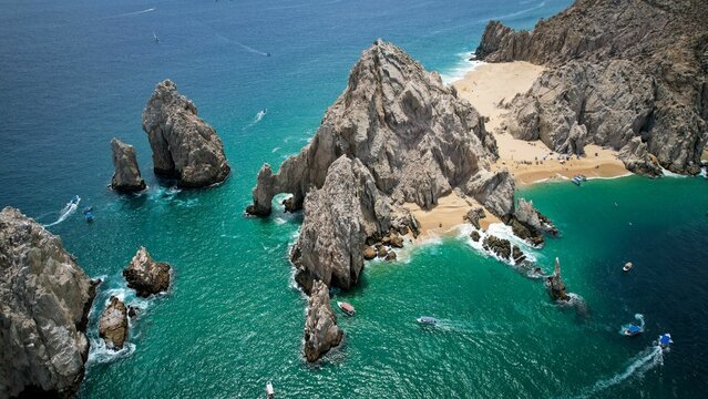Dramatic aerial view of remote rocky island surrounded by ocean waves