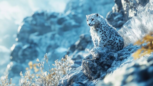 Majestic snow leopard perched on a rocky mountainside, overlooking a stunning Himalayan valley.