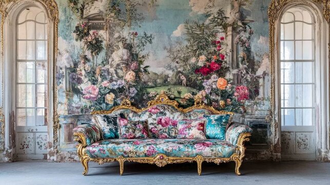 Interior room with vintage baroque floral wallpaper, combining opulent floral patterns with refined design.