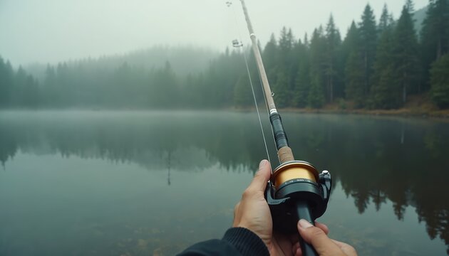 Person fishes on calm lake with dense forest in mist. Hand holds fishing rod, waits for bite in quiet morning. Outdoor hobby offers peaceful solitude.