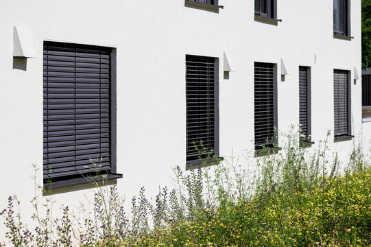 Window Blinds Outside, Modern External Roller Blind Outdoor of Modern Building Facade. Exterior Window Roll up Blinds. Outdoor Window Shades.