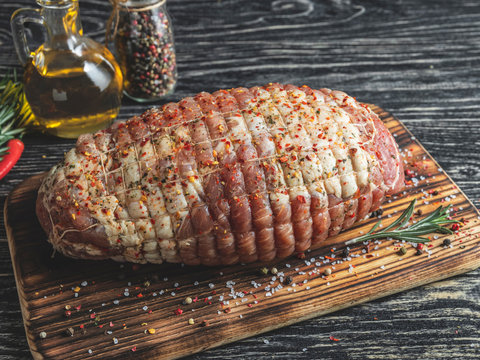 Raw pork roulade. Raw rolled meat enclosed in tied netting
