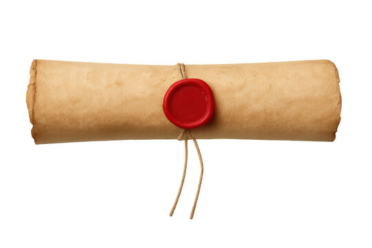 Vintage parchment scroll bound with twine, sealed by crimson wax, symbolizing historical legal documentation against transparent backdrop