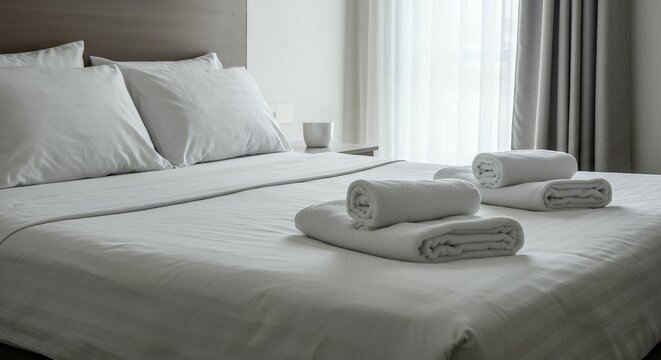 Clean hotel bed with folded white towels and rolled linens near window with sheer curtains in modern minimalist guest room