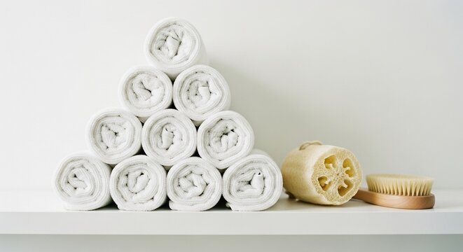 White rolled towels and bath brushes neatly arranged on shelf representing calm cleanliness and mindful organization