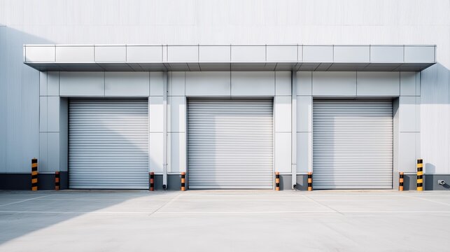 Modern industrial warehouse building exterior with three closed roller shutter doors. Grey facade and empty concrete loading dock area for logistics and shipping.