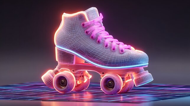 A glowing neon roller skate zooms across a disco floor, embodying the vibrant energy of roller skating and the fun of retro music nights.