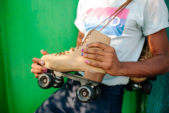 Young black male wearing VALID t-shirt holding rollerskate
