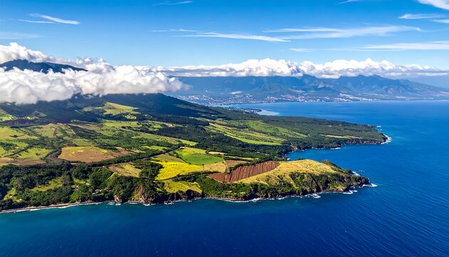 Aerial view of a coastal landscape with rolling hills and clear waters