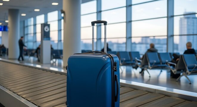Blue rolling suitcase sitting on an airport baggage carousel conveyor belt with blurred passenger waiting area in the background during sunset